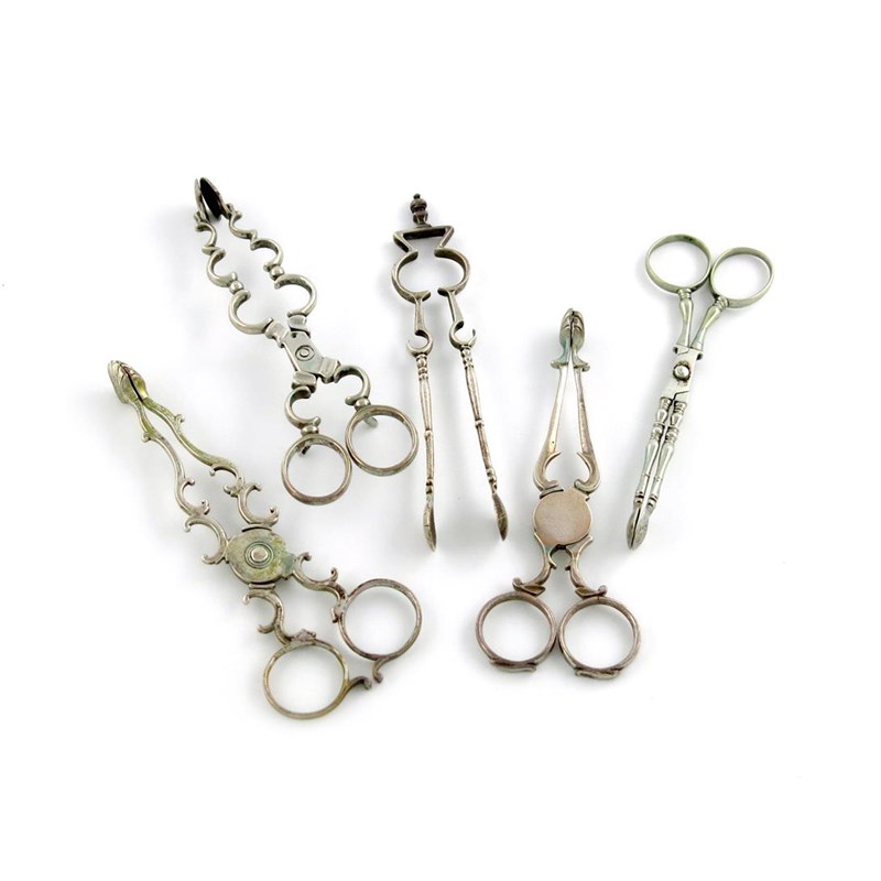 comprising: a pair of andiron form, plus a pair with baluster arms, the reverse of the bowl engraved with a crowned 'R', plus three pairs with scroll arms, approx. weight 4.8oz. (5)