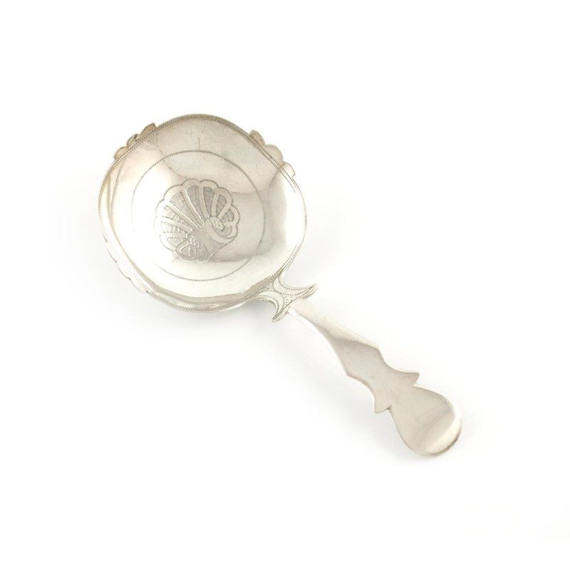 large shaped circular bowl, engraved borders and with a central shell motif, with a fish-tail tapering handle, length 10.8cm, approx. weight 0.5oz.