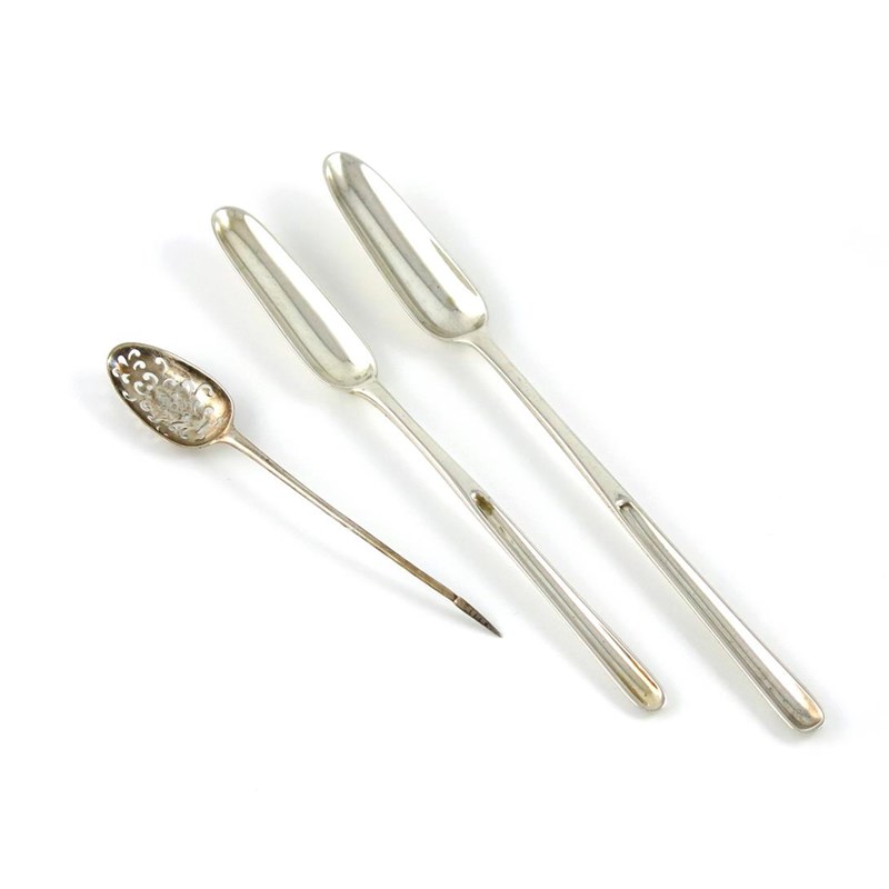 conventional form, plus another George III silver marrow scoop, London 1781, and a George III silver mote spoon, maker's mark PR, approx. weight 3.3oz. (3)