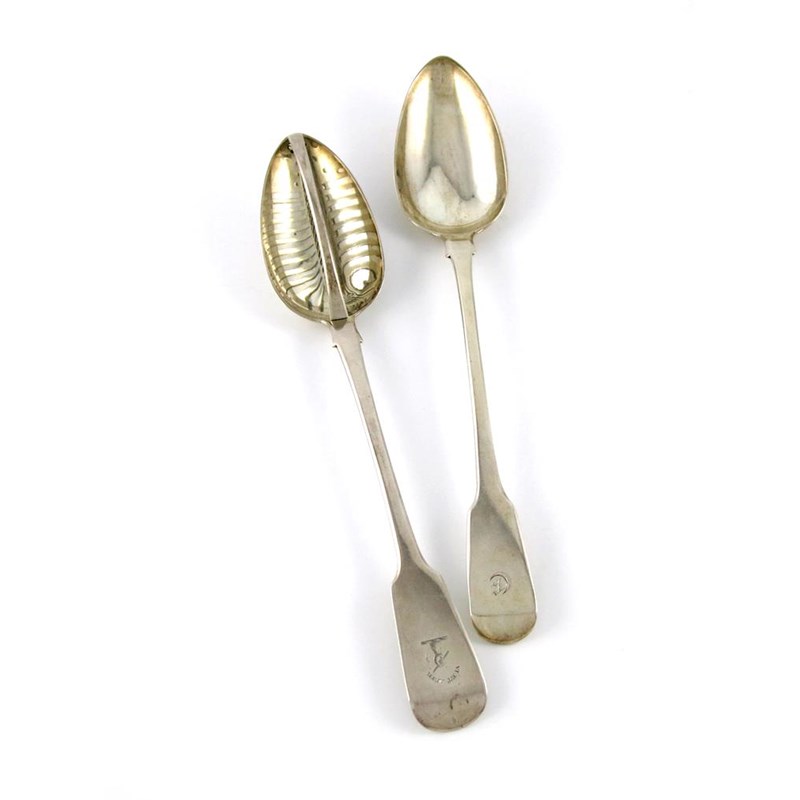 the bowl with a detachable strainer, the terminal with a crest, plus a Fiddle pattern basting spoon, by Richard Crossley, London 1805, approx. total weight 8.5oz. (2)