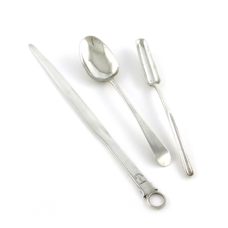 comprising: a George III marrow scoop, by Eley and Fearn, London 1804, an Irish provincial tablespoon, by Carden Terry, Cork circa 1800, and a meat skewer, with a flattened stem, approx. weight 6.5oz. (3)