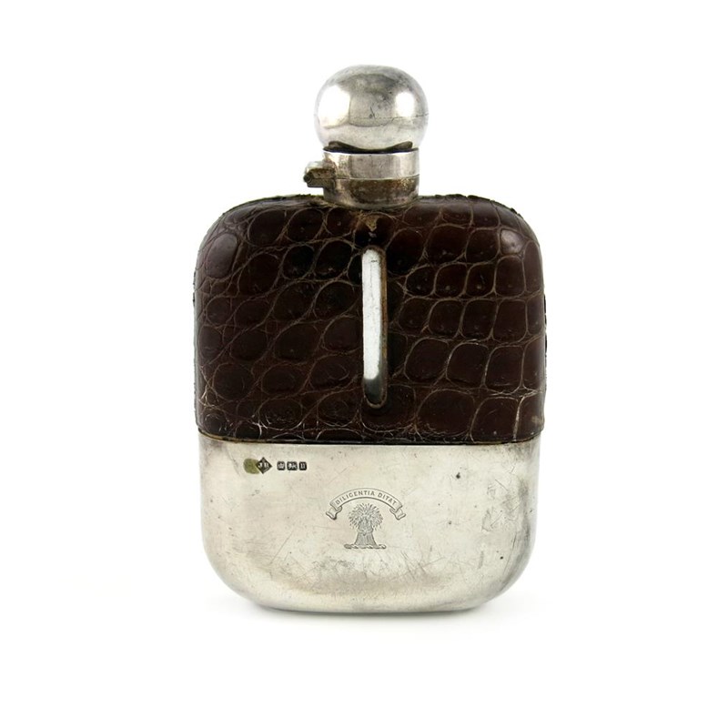 λA silver and crocodile skin mounted hip flask