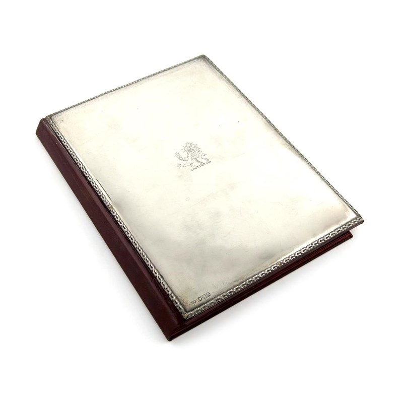 rectangular form, foliate border, the centre with a crest, red leather back, length 28.7cm.