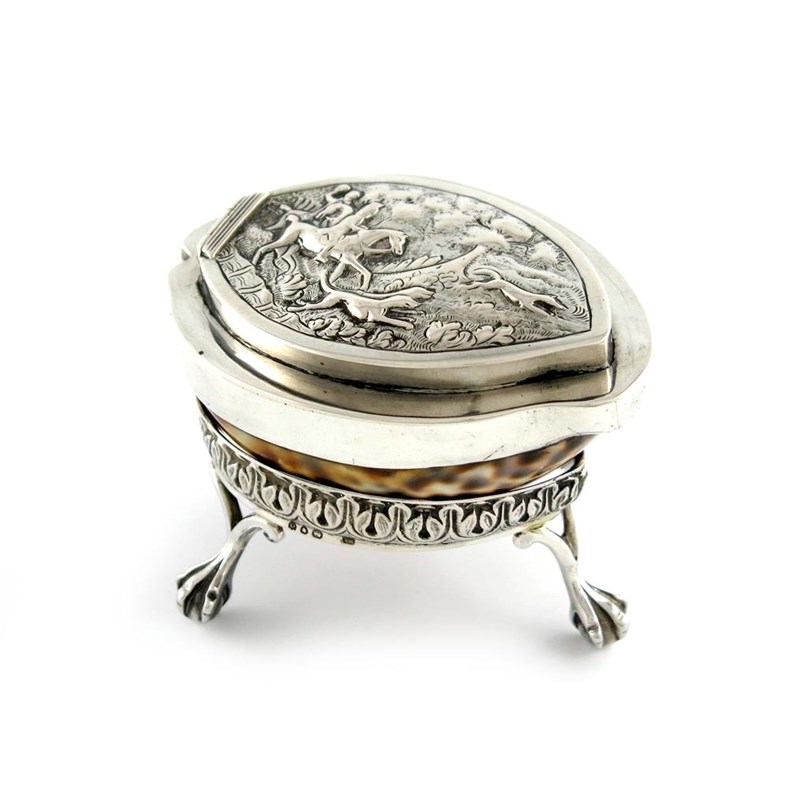 the hinged cover embossed with a hunting scene, on a Victorian silver stand, London, 1889, length 9cm.