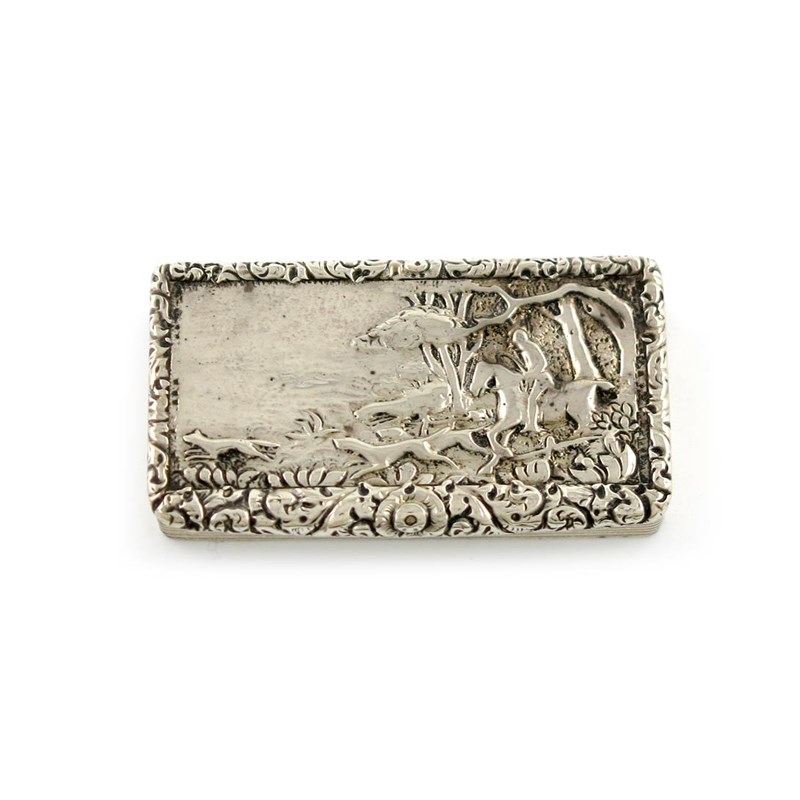 rectangular form, the hinged cover with a hunting scene with a horseman and hounds chasing a fox, in a landscape setting, reeded sides, engine-turned base with a vacant cartouche, foliate scroll thumb-piece, gilded interior, length 7.3cm, approx. weight 3.5oz.