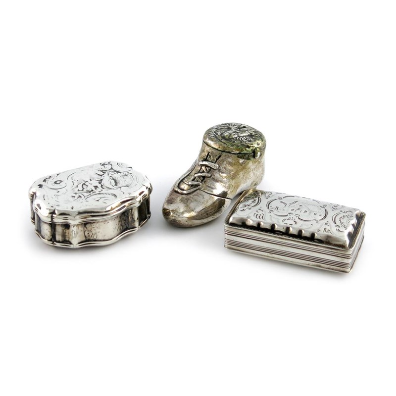comprising: a German box modelled as a shoe, the hinged cover embossed with a stag, a deer and a wild boar, plus a Dutch box of rectangular form and a box of cartouche form, embossed with figural scenes, approx. weight 5oz. (3)