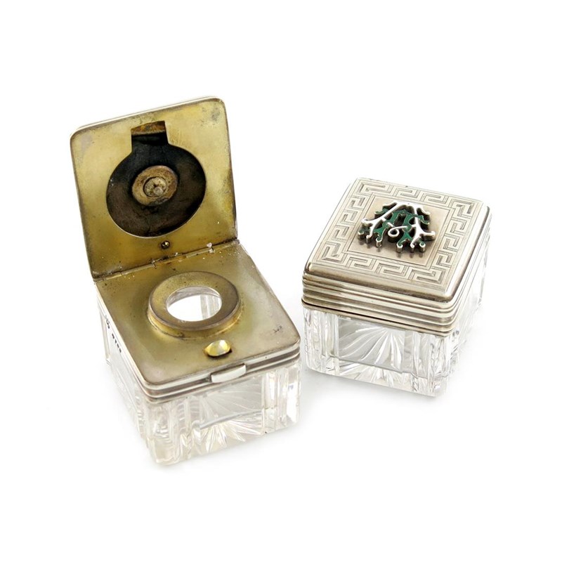 A Victorian silver-mounted glass travelling inkwell and vesta box