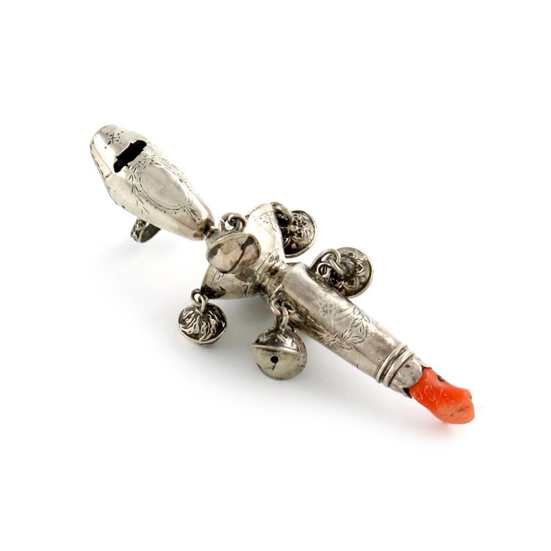baluster form, engraved decoration, with eight hanging bells, and with a ring attachment and coral teether, length 12.5cm, approx. weight 1.5oz.