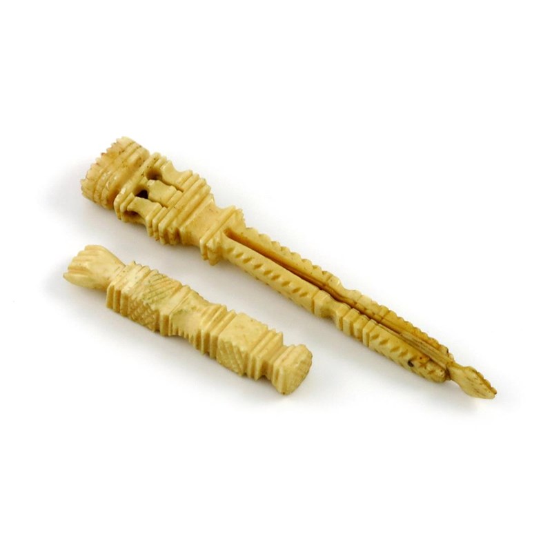 tapering form, with two hinged toothpicks, plus a carved bone pipe tamper modelled as a fist and arm, lengths 9cm and 5cm. (2)