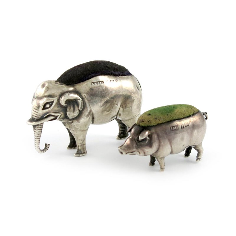 modelled in a standing position, plus an Edwardian novelty silver pig pin cushion, by the same maker, date letter rubbed. (2)