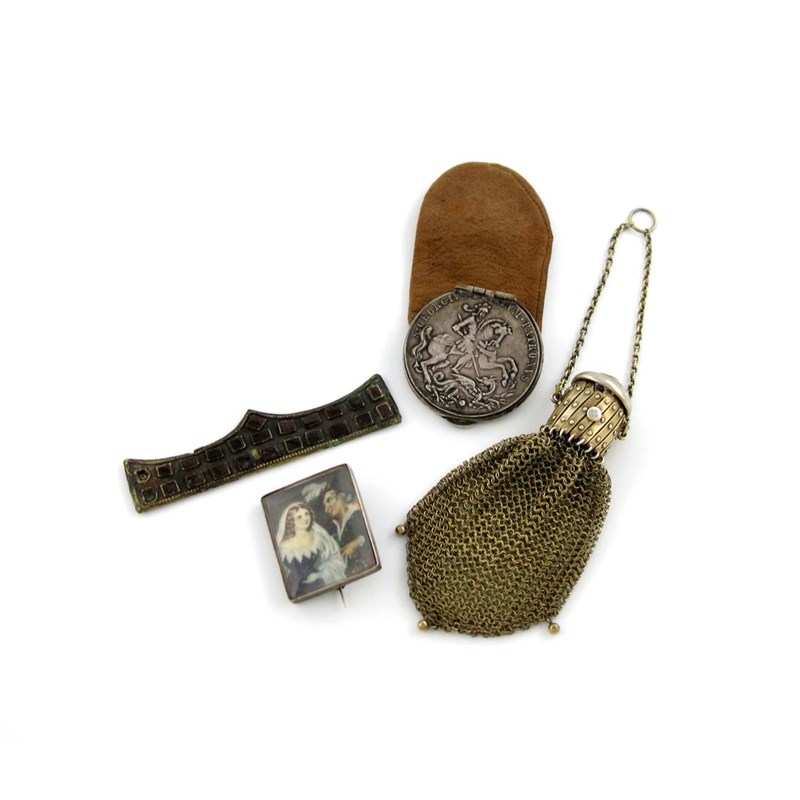 comprising: a silver-gilt mesh purse, with a concertina closing neck, and with a purple finial and chain attachment, plus a silver and suede purse, the cover formed with a coin, and a small rectangular portrait miniature of a lady and gentleman, and a small pediment set with garnets. (4)