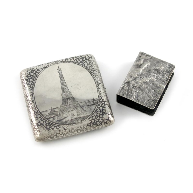 with a scene of the Eiffel Tower, plus a Russian silver match box cover with textured decoration, approx. weight 5.3oz. (2)