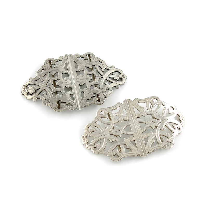 pierced and engraved decoration, plus another Victorian silver nurse's buckle, by C. Cheshire, Birmingham 1897, pierced and engraved decoration, approx. weight 3.6oz. (2)
