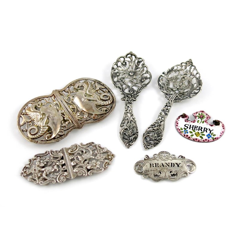 comprising silver items: an Edwardian buckle, by William Hutton and Sons Limited, London 1901, the two sections cast with a dragon holding a shield with scroll decoration, length 11cm, plus two pierced spoons, a wine label pierced 'BRANDY', another belt buckle, Birmingham 1898, and an enamelled wine label titled 'SHERRY', approx. weighable 5.5oz. (6)