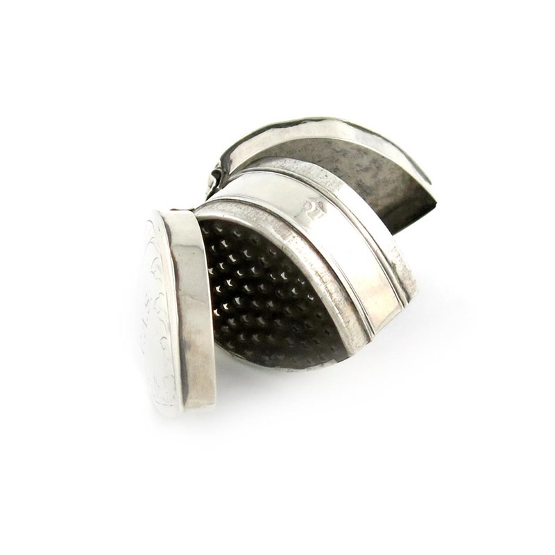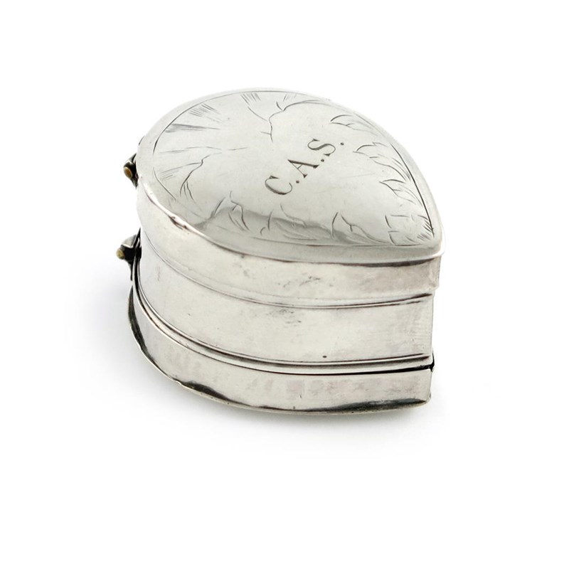 plain tear drop form, hinged cover and base, with engraved decoration, the cover later initialled 'C.A.S', length 4cm, approx. weight 0.7oz.