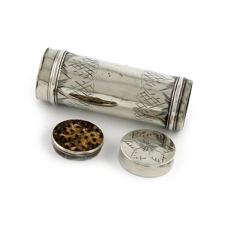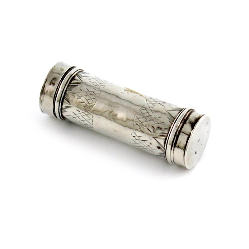 tubular form, engraved decoration, the pull-off cover opens to reveal a later grater, length 6.2cm, approx. weight 0.5oz.