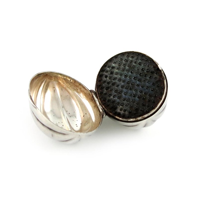 fluted melon form, the hinged cover opens to reveal a hinged steel grater, length 5.2cm, approx. weight 1.5oz.