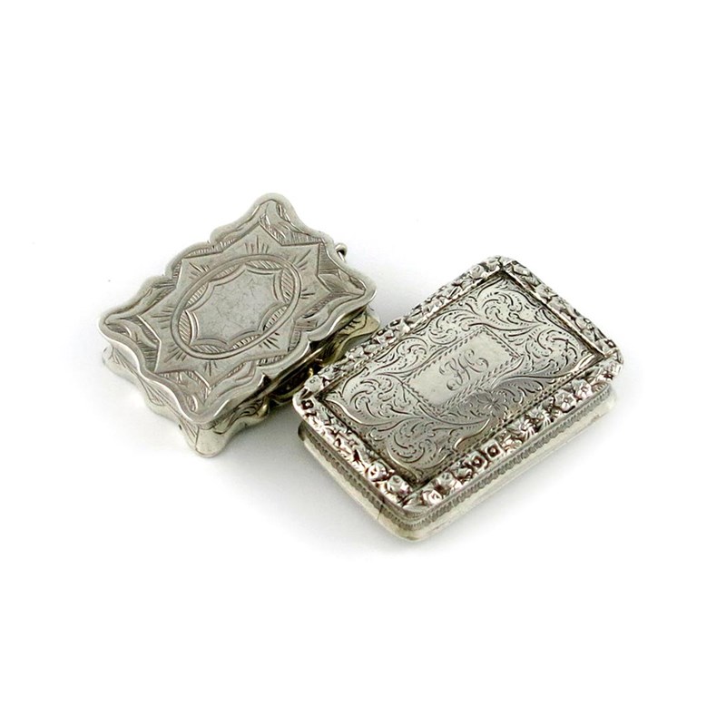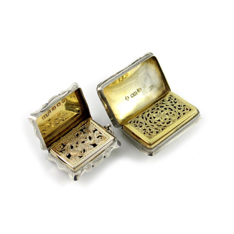 rectangular form, engraved decoration, foliate borders, pierced foliate scroll grille, plus another vinaigrette, by Hilliard and Thomason, Birmingham 1878, shaped rectangular form, approx. weight 1.4oz. (2)