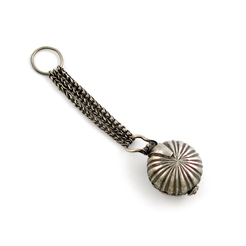 fluted circular form, the hinged cover opens to reveal a filigree grille, with a chain and ring attachment, diameter 2.3oz, approx. weight 0.4oz.