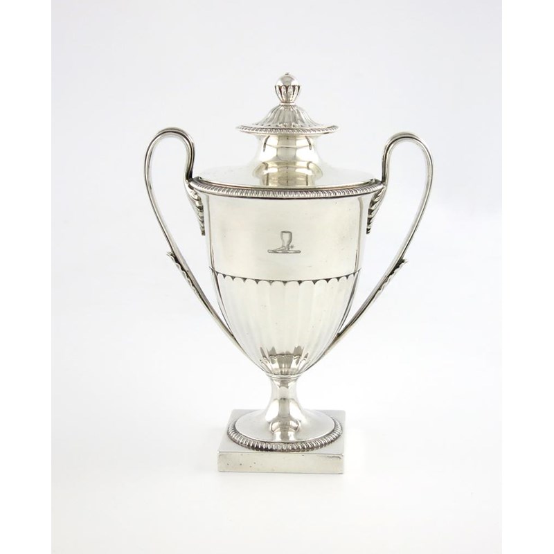 circular form, part-fluted decoration, leaf-capped reeded loop handles, pull-off fluted cover, engraved with a crest, on a raised square base, height 19.5cm, approx. weight 17.8oz.