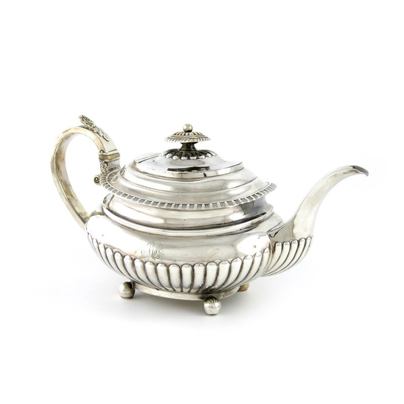 oblong bellied form, part-fluted decoration, shell capped scroll handle with ivory insulators, the hinged cover with fluted decoration, initialled, on four ball feet, length handle to spout 29.5cm, approx. weight 20oz.