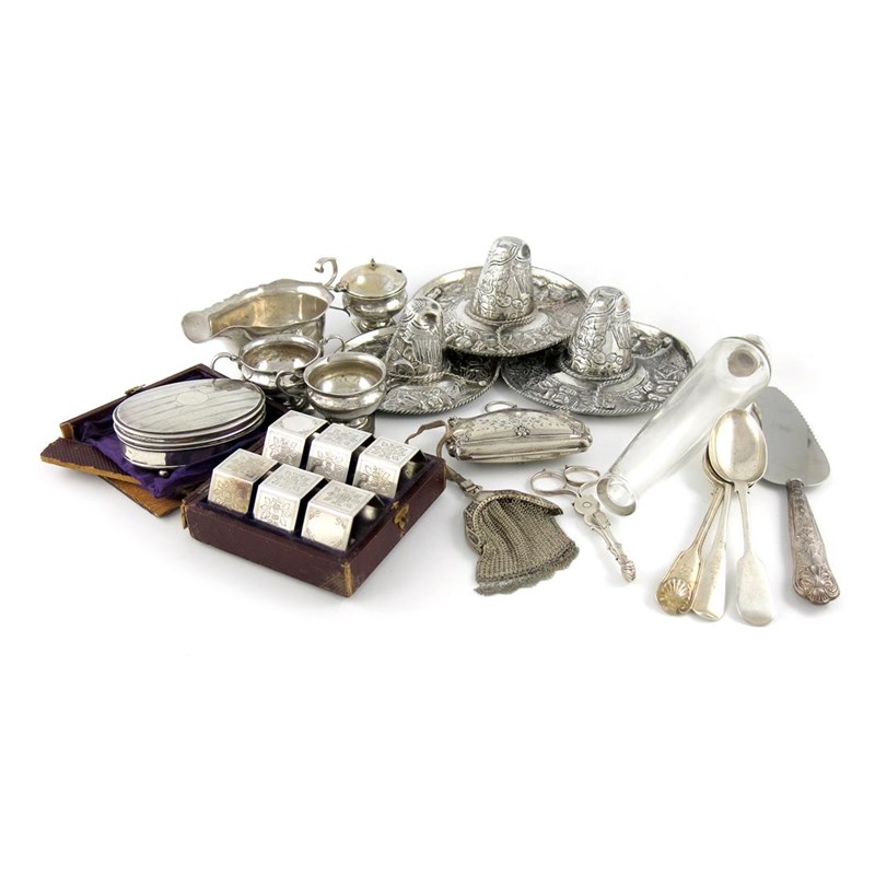 comprising: a purse, a trinket box, a sauce boat, three Peruvian hats, a silver-mounted glass saddle flask, a pair of salt cellars, plus other items including flatware and six electroplated napkin rings, cased, approx. weighable 12.8oz. (qty)