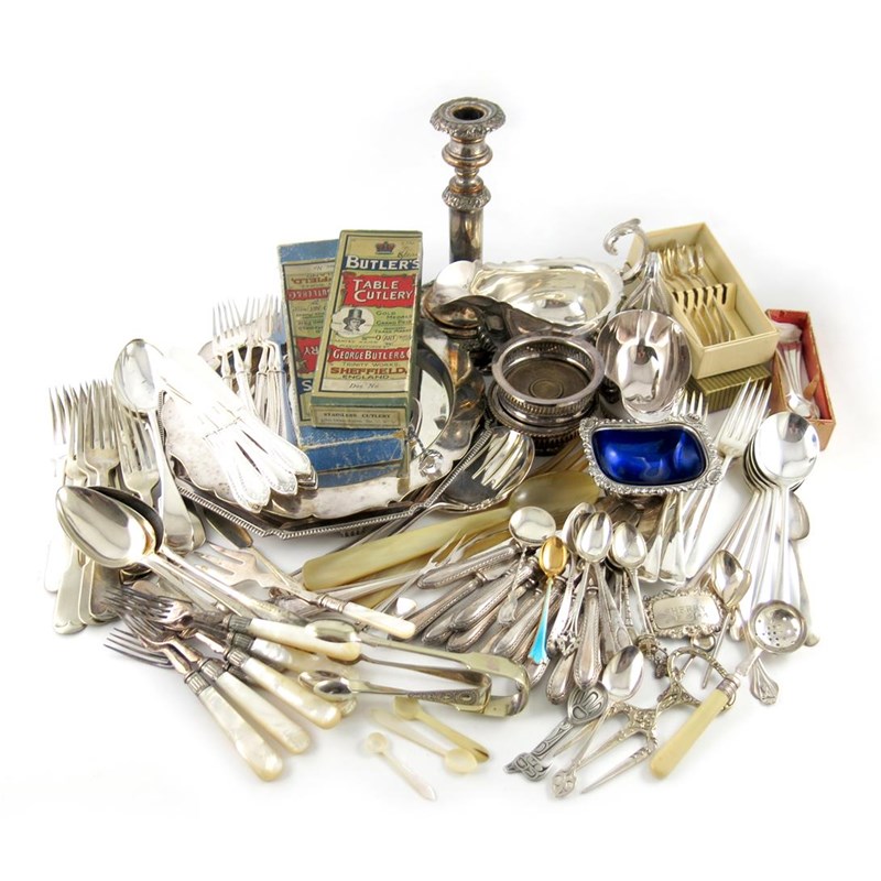 comprising silver items: a pair of Victorian tablespoons, London 1893, a Norwegian tablespoon, six boxed Norwegian teaspoons, a set of six George III teaspoons, London 1818, a set of six George IV silver teaspoons, London 1828, an Irish teaspoon, a set of twelve silver-handled tea knives, a modern wine label, a jam spoon, twelve various teaspoons, plus electroplated items: a salver, a bread board mount, a French sauce boat, another sauce boat, a pair of coasters, a candlestick and other items including a quantity of flatware, approx. weighable 18oz. (qty)