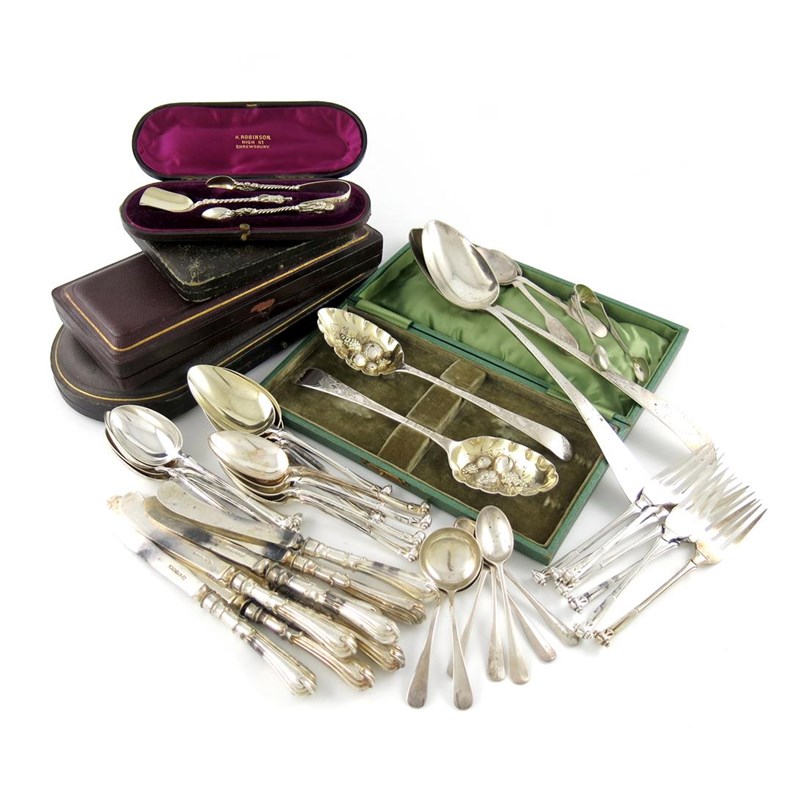 comprising: two similar George III Irish Bright-cut basting spoons, one by John Sheils, Dublin 1790, the other marks partially lost in a repair, Dublin 1798, the terminals crested, the reverse of the heels initialled, a cased set of silver-gilt Kings pattern berry spoons, two further cased pairs of berry spoons with gilded bowls, a cased caddy spoon and sugar tongs, Apostle finial, Exeter 1861, by J. Williams, six coffee spoons, a pair of cream ladles, a pair of sugar tongs, eight teaspoons, and an electroplated dessert set, approx. weighable 25oz. (qty)
