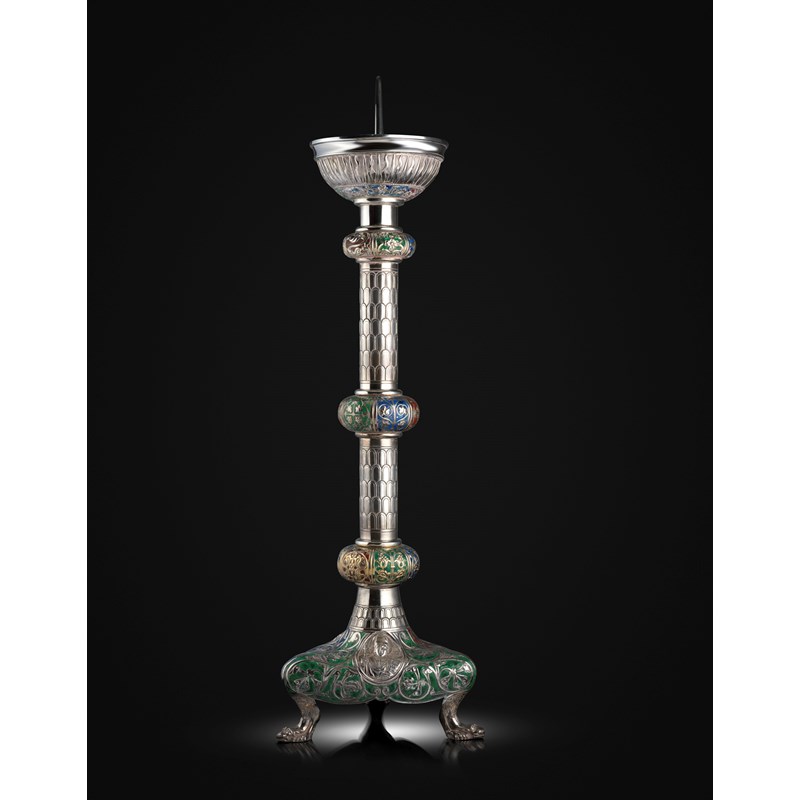 the cylindrical column with three knops, some traces of gilding, each with foliate decoration on green, red and blue enamel backgrounds, large circular tapering drip pan, with a central spike, on a raised triangular base with saint Irenaeus, Clement and Ignatius, and with blue, red and green enamel decoration, on three mask pad feet, the centre with a metal core, height 87cm.