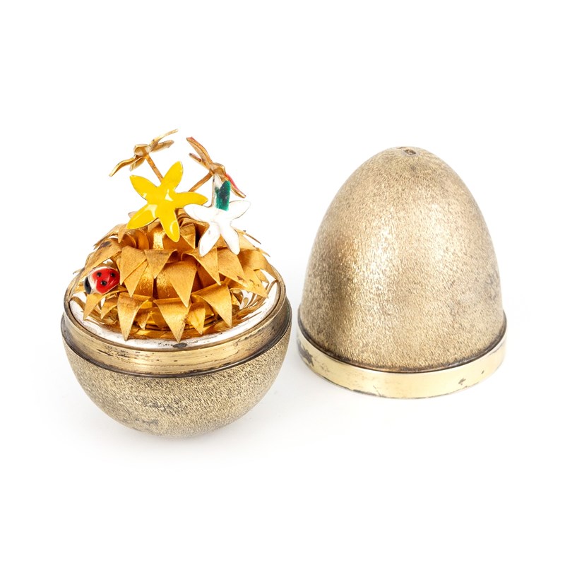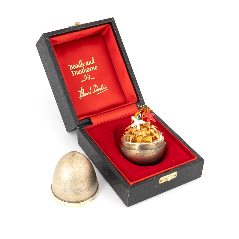 By Stuart Devlin, a modern cased silver-gilt, silver and enamel surprise egg,