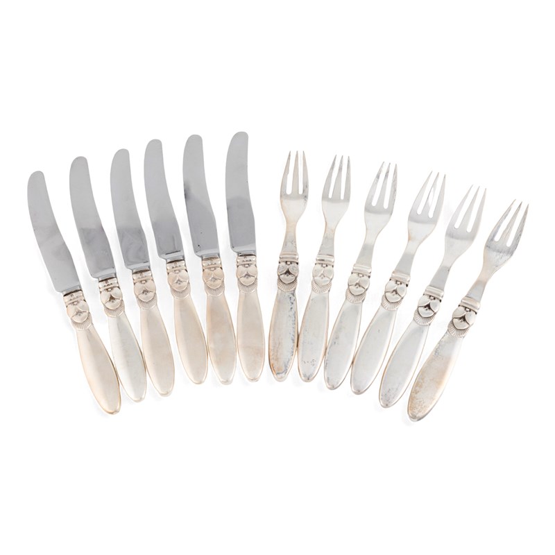 Designed by Gundorph Albertus for Georg Jensen, a set of six Danish silver Cactus pattern fruit knives and forks,