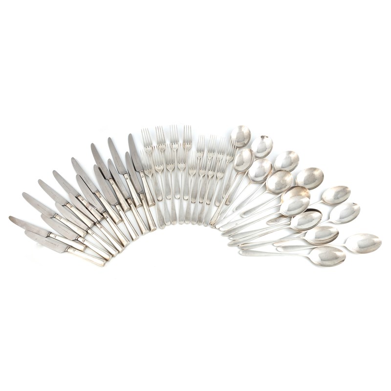 comprising: eight soup spoons, eight dessert spoons, eight table forks, eight dessert forks, eight silver-handled table knives and eight silver-handled dessert knives, total approx. weighable 51oz. (48)