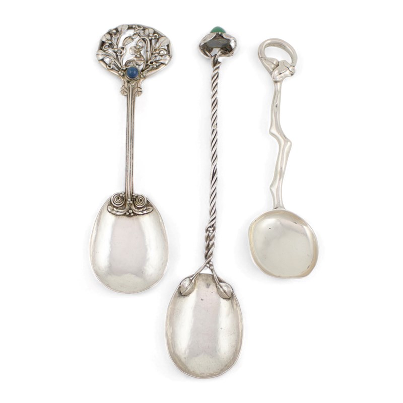 comprising: one by Moss Morris, London 1901, moulded branch stem with a ring foliate terminal, one stamped 925 with a long twisted stem and a green stone cabochon, possibly a chrysoprase, length 18.5cm, and one unmarked with a reeded stem and foliate terminal with a blue lapis cabochon, total approx. weight 3.2oz. (3)