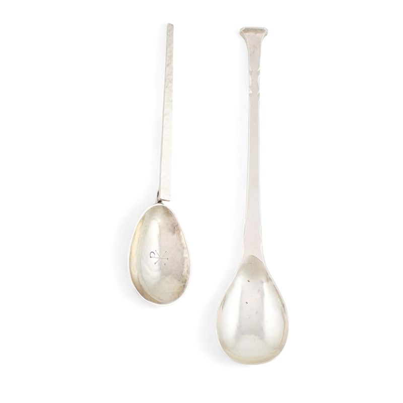 fig-shaped bowl with a tapering stem and a rectangular seal-top finial, length 18.6cm, plus an Arts and Crafts silver spoon by A. E. Jones, London 1968, spot-hammered decoration with an engraved Chi Rho to the bowl, with a tapered stem, total approx. weight 2.9oz. (2)