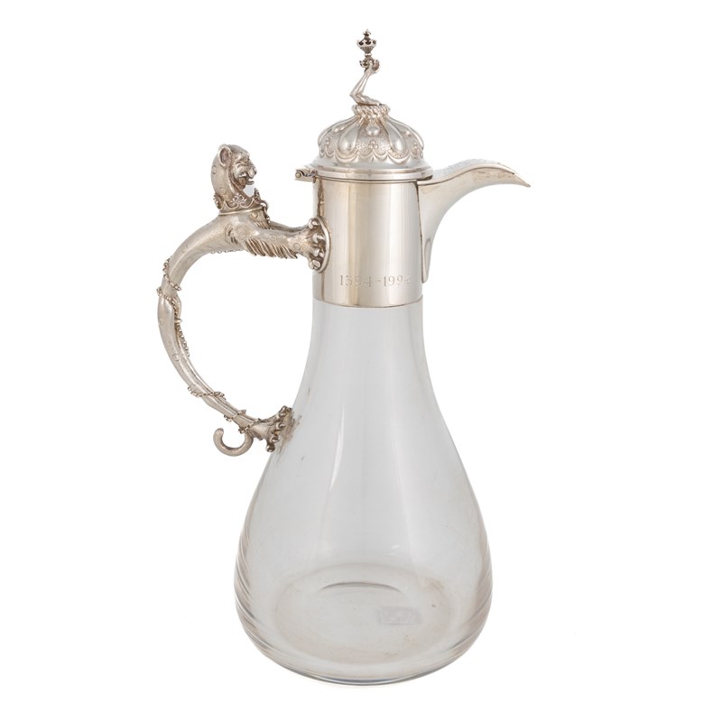 tapering bellied form, the handle in the form of a leopard with textured decoration, the domed hinged cover has fluted decoration and the Salters Company crest as its finial, height 31.2cm