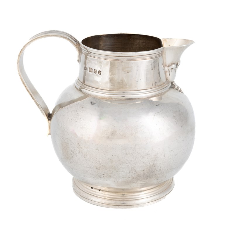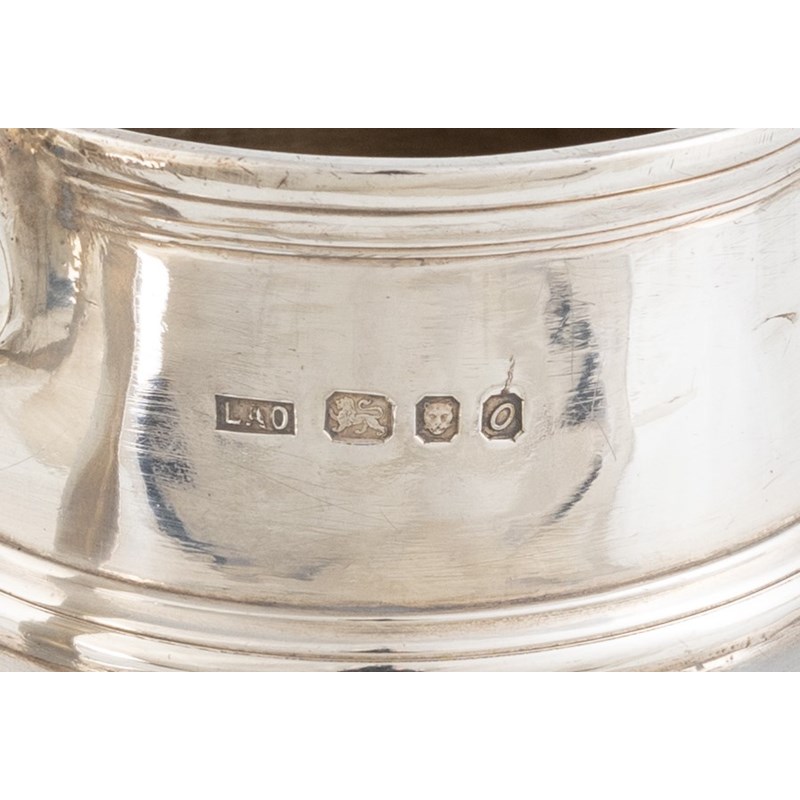 plain circular bellied form, reeded scroll handle, on a raised circular foot, height 11.9cm, approx. weight 11.8oz.