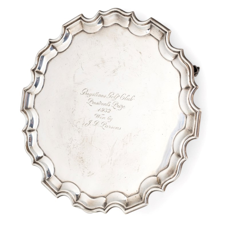 circular form with a moulded border, inscribed to the centre' Greystones Golf Club Presidents Prize 1932 Won by J.D.Parsons', on three gnarl feet, diameter 26.1cm, approx. weight 21.3oz.