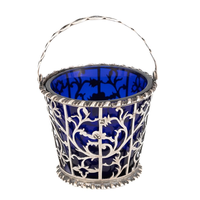 circular tapering form with pierced scroll decoration, engraved initials, pierced swing-handle, with a blue glass liner, height 6.6cm, approx. weigh 2.3oz.