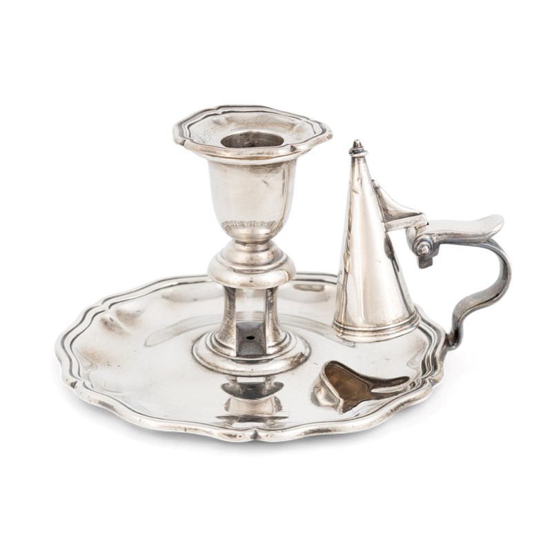 circular form, moulded border, scroll handle, with a conical snuffer, diameter 14.5cm, approx. weight 9.9oz.