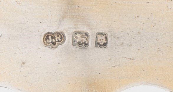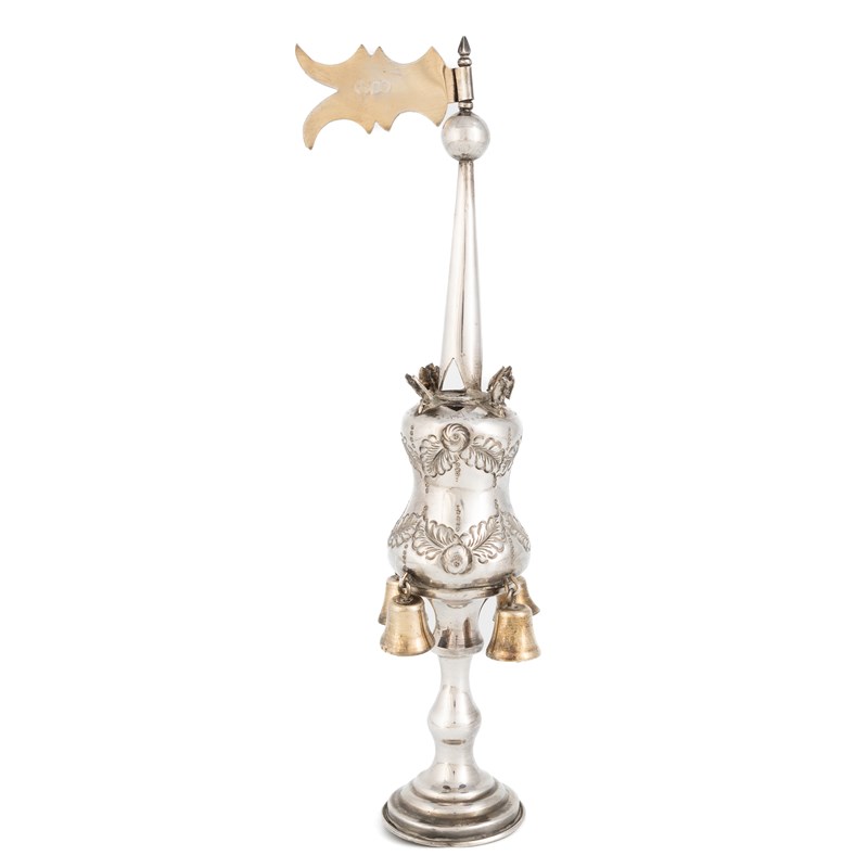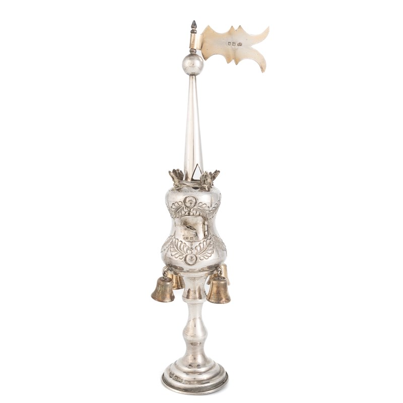 baluster form, foliate decoration, hinged door, four bells and with a flag finial, on a circular foot, height 27.5cm, approx. weight 5oz.