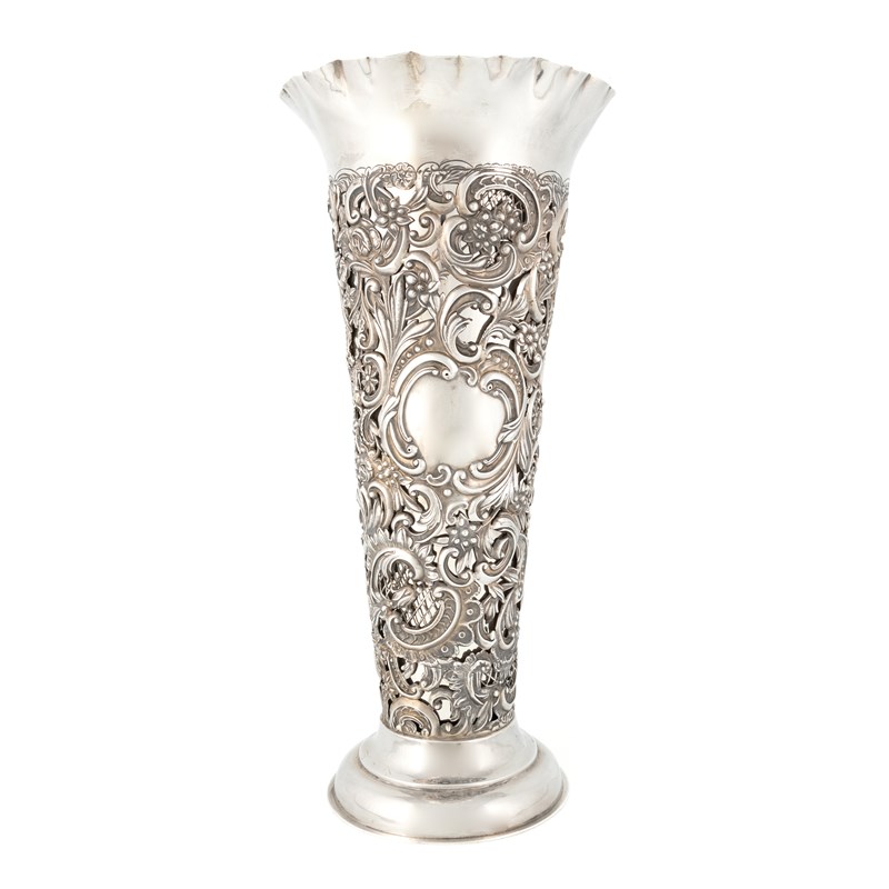 tapering circular form, pierced and embossed with foliate scroll and trellis decoration, crimped border, on a raised circular foot, with a detachable electroplated liner, height 41.5cm, approx. weight 25oz.