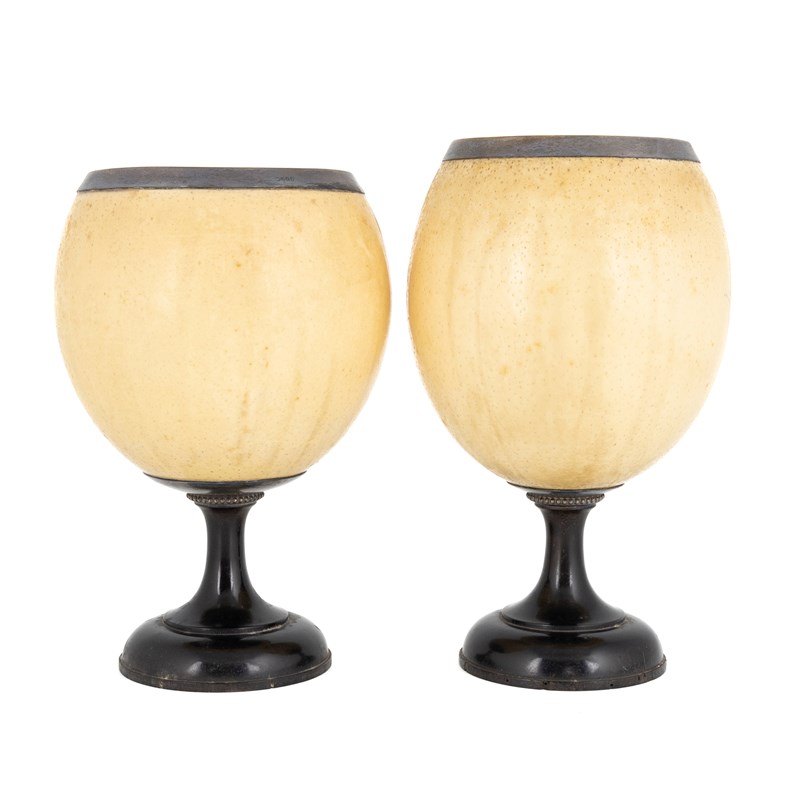 plain circular mounts, on raised wooden circular tapering feet, height 21.7cm and 20cm. (2)
