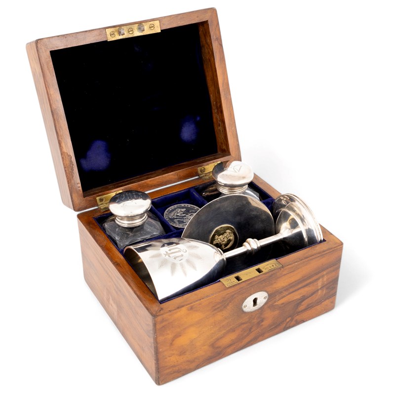 comprising: a goblet/chalice, by Reily and Storer, London 1841, plain urn bowl, engraved with a variation of 'IHS', plus a paten, by John Salt, London 1866, circular form, the centre set with a worn gold Byzantine coin, the pyx box mounted with a Victorian crown and a George III crown, and two silver-mounted bottles, London 1887, in a fitted wooden case, approx. weighable 10.5oz.