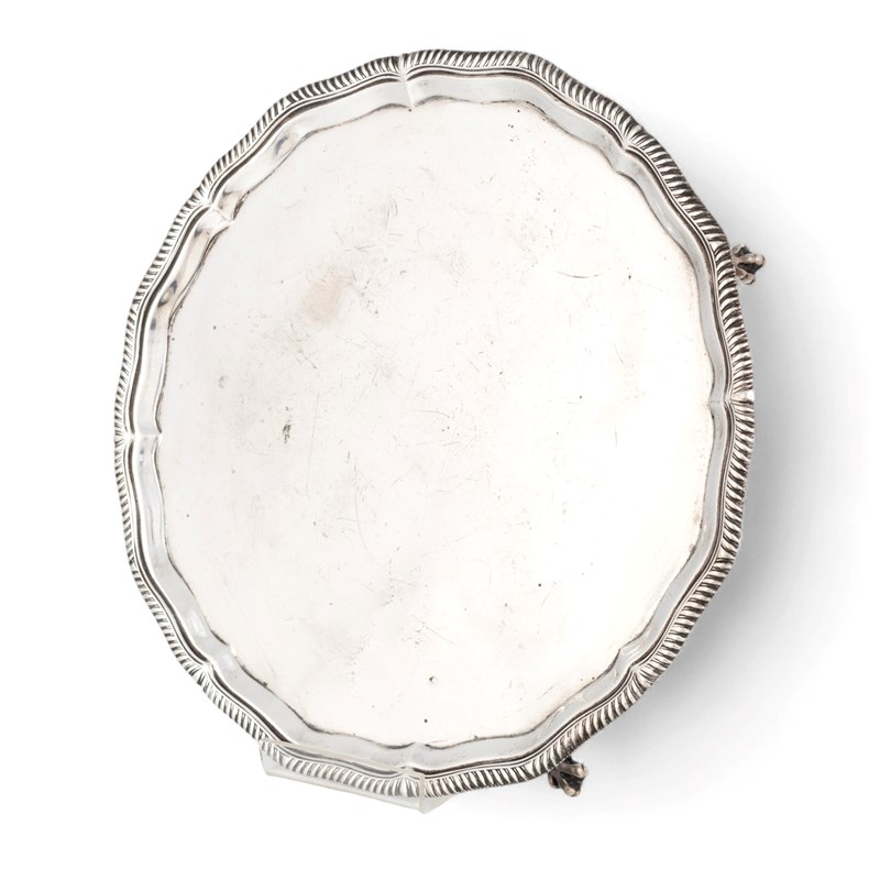 circular form, gadroon border, on four claw and ball feet, diameter 26cm, approx. weight 19.7oz.