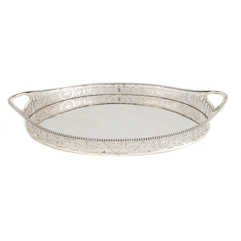 oval form with a beaded border, pierced scroll foliate gallery, inset handles, length 46cm, approx. weight 44.6oz.