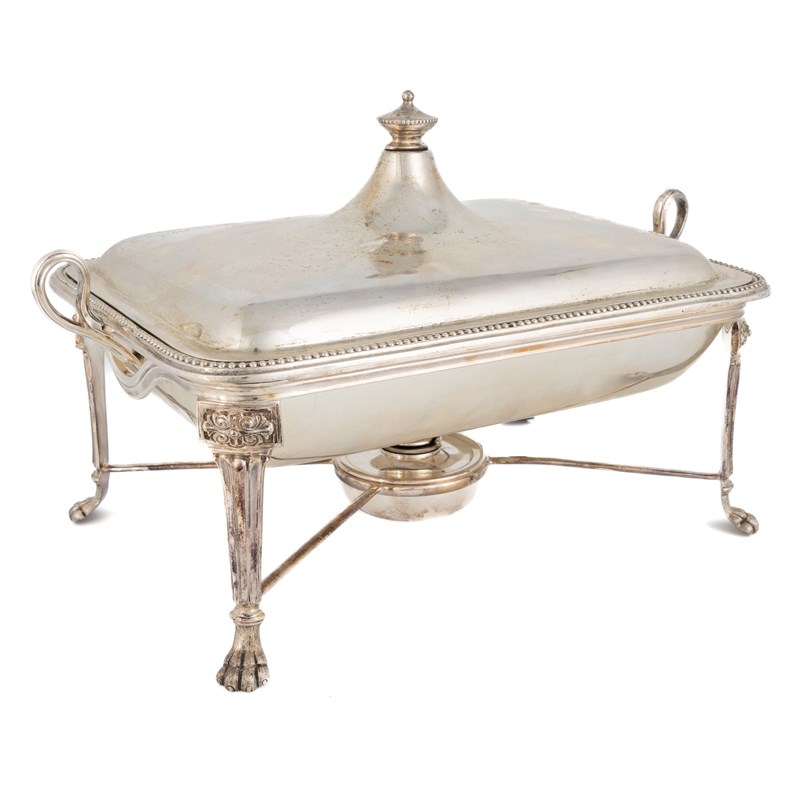 rectangular form with a beaded border, the cover with a raised beaded knop finial, interior liner, scroll find handles, length 34.6cm, plus an electroplated stand and burner, with reeded border decoration, wire-work frame, on four paw feet, total approx. weighable 64.5oz.