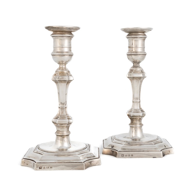 knopped baluster stems, spool shaped capitals, detachable drip pans, on loaded square bases with canted corners, height 19.6cm. (2)