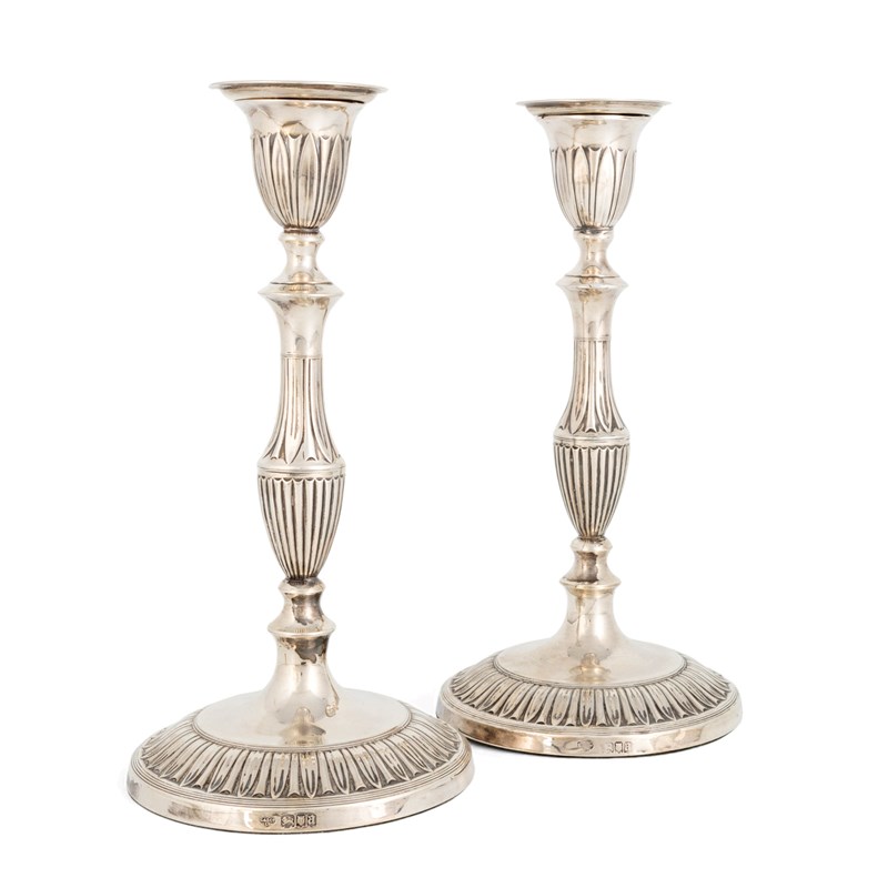 knopped baluster form, with stylised petal and part fluted decoration, pull-off drip pans, on raised circular loaded bases, height 25.8cm. (2)