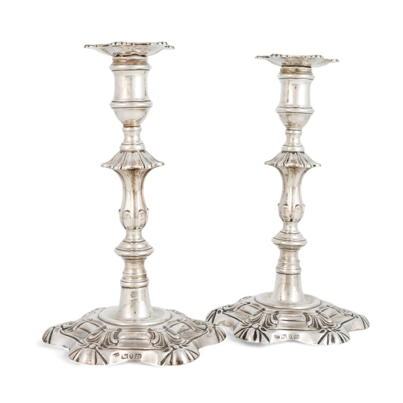 baluster columns, shell shoulders, spool-shaped capitals, removable drip pans, on raised hexafoil bases with Anthemion motifs, height 22.2cm. (2)