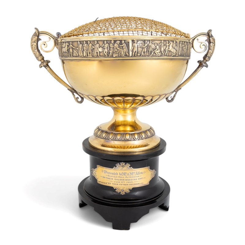 circular form, with a classical frieze on a matted background, leaf-capped scroll handles, on a raised circular foot, with a base metal flower mesh, on an ebonised plinth applied with a silver-gilt plaque inscribed 'Presented to Mr and Mrs Allen, Oldfield Hall Altrigham on their Golden Wedding Day June 5th 1883 by their fifteen children', length handle to handle 39.5cm, approx. weight 63oz.
